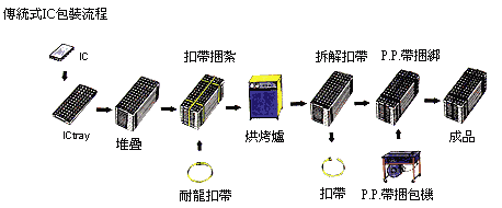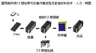 - 抗靜電耐烤P.P.捆包帶:150°C烘烤48小時以上,不會破壞捆包帶及捆包物,抗靜電阻質11歐姆以下